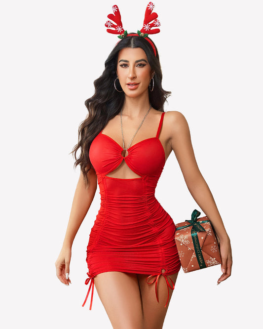 Sheer Mesh Chain Halter Ruched Dress with Thong